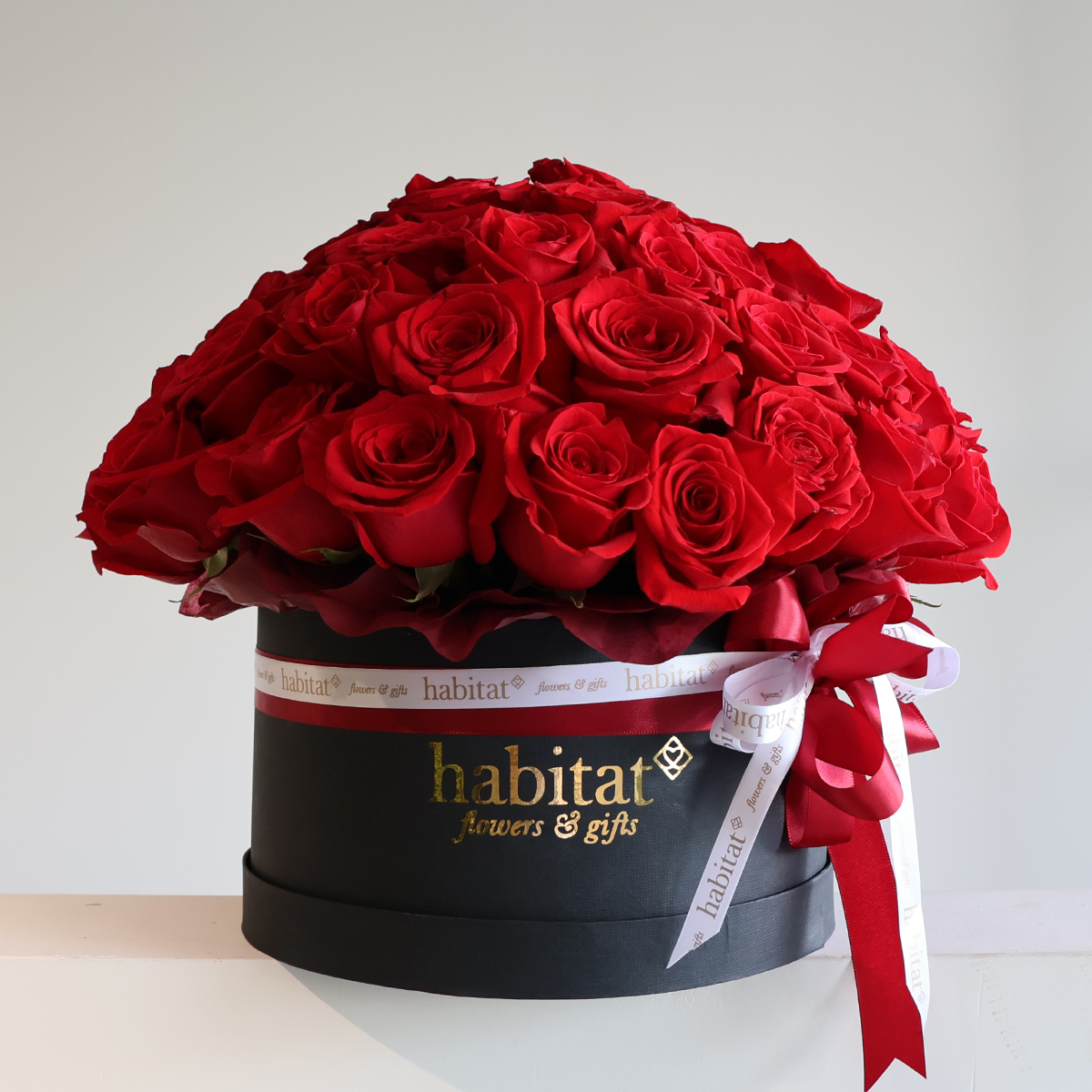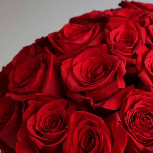 Dekorativna kutija sačinjena od 53 crvenih Ekvador ruža u kombinaciji sa zelenilom