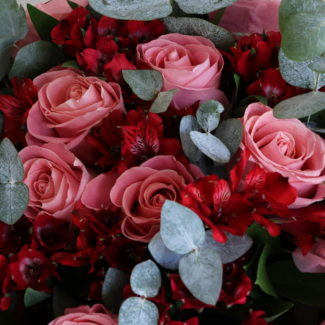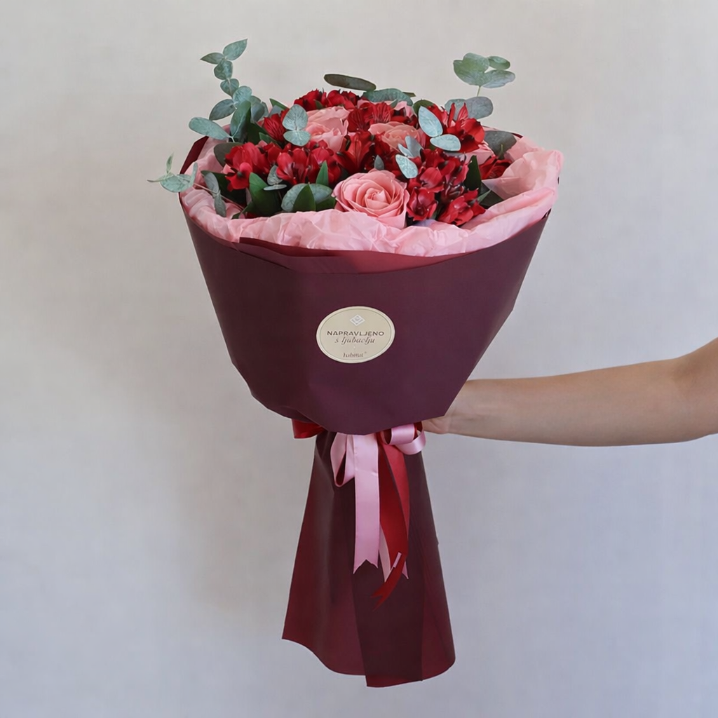Buket sačinjen od 9 pastelnih ruža, 4 astromerija u kombinaciji sa zelenilom i dekorativnim papirom .
