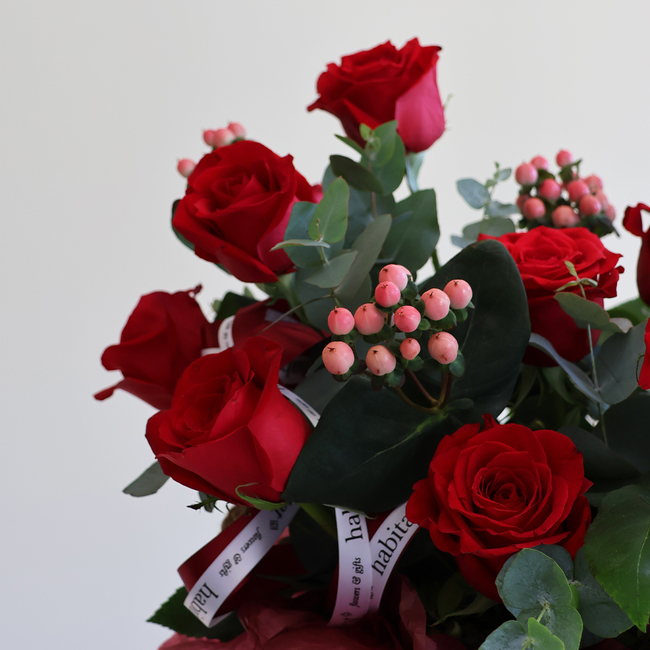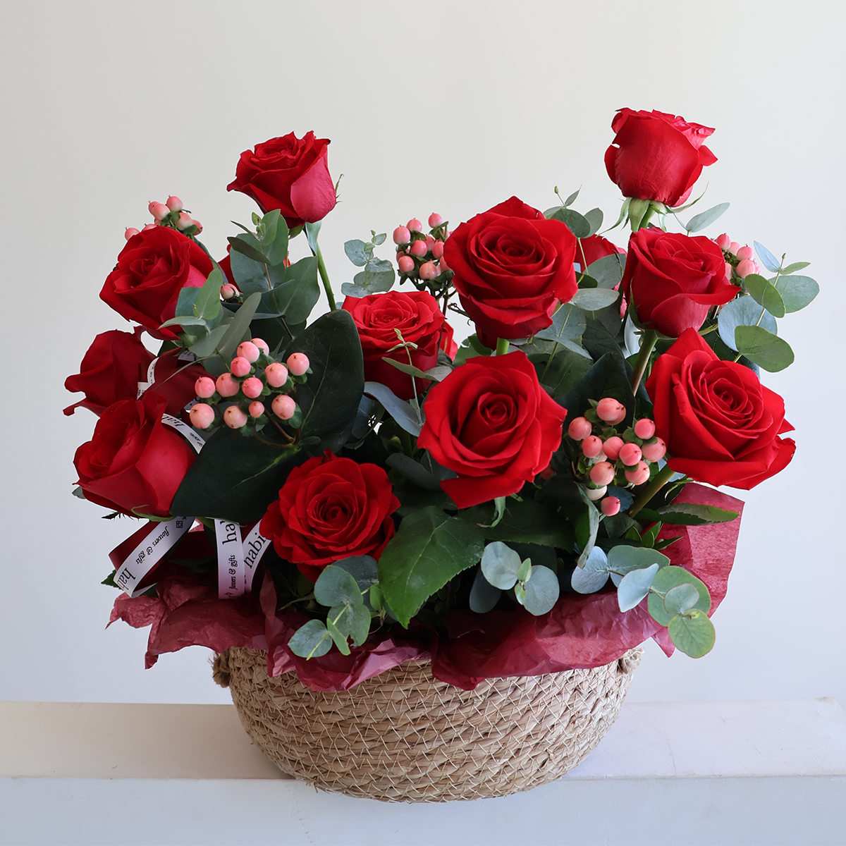 Korpa sačinjena od pažljivo odabranih svježih cvjetova.Aranžman je sačinjen od crvene Ekvador ruže hiperikuma u kombinaciji sa zelenilom i dekorativnim papirom.