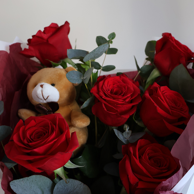 Buket sačinjen od crvenih ruža i eukaliptusom u kombinacijom sa plišanim medom i dekorativnim papirom